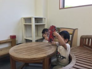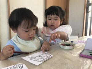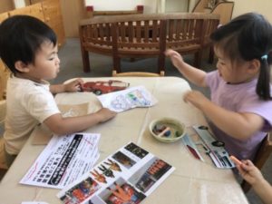 また、別の場所ではイラストにお絵描きしたり、はさみで切ったり、消防車の絵本を見たりと同じように盛り上がっていたようです。また近くで本物を見た時には、きっと大興奮なんだろうなぁ~と想像が膨らみ楽しみです。