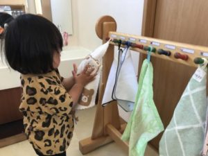 園庭で楽しい会話をしながら賑やかに遊ぶ毎朝の光景ですが、どんなに遊びが盛り上がってても救急車の音には負けてしまいます。今日もピーポーピーポーという音が・・・みんな一目散でフェンスのところに行き近くに止まった救急車にくぎづけでした。「あそこにいるー。」「ピカピカ光ってるね!」などと言いながら救急隊員さんたちの様子も見ていました。そんな子どもたちの姿から消防署にある乗り物をラミネートした物を掲示したり、イラストなどを用意してみました。掲示してあった物に気づいたお友だちは「わぁ!!救急車だ!」と言いながら手に取りながめ始めましたよ。すぐ横にあったお絵描きコーナーに行くのかな?と見ていると、それをもって隣の丸テーブルに移動。机のデザインで細い隙間があるのですが、下からその隙間にカードを通し、まるでペープサートのように遊び始めました。こんな遊び方もあるんだなあ~と感心した一面です。お絵描きのほうでは消防隊員や救急隊員のカードを見て「かっこいいなぁ~」としみじみ言いながら見たり、細かなところまでしっかり色塗りをしたりして楽しんでいました。