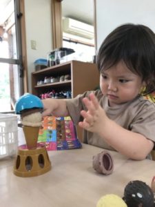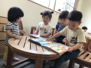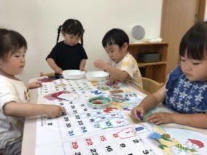 外はあいにくの雨。子どもたちは雨続きの日で少し残念そう。好きな玩具を机の上に運んできてお友だちと楽しそうに遊んでいます。このような姿を横目に大きなカレンダーを机の上に広げていると・・・子どもたちが周りに集まって来ました。すると「なになに?なにしてるの?」と。大きなカレンダーを囲み「いち、にー、ごー、さん」と数字を口ずさんでいます。別の子は数字の色に気がついた様で「あか!」「これは〇〇がすきなくろだよ」と色の話をしているお友だちもいました。子どもたちから聞こえてきた数字を紙に描いてみると・・・「これ、ぴんくにする!」「ぬりぬりかしてー!」とリクエストが聞こえ、色塗りが出来るアイテムを用意すると「そうそう!これこれ!!」と色塗りが始まりました。色のカードも用意してみると「これ、△△が好きなぴんく!」「せんせいはしろがすきなんだよねー」などと友だちとの会話も楽しんでいます。更なる色のアイテム絵の具が入った箱を子どもたちの前で開けてみると、それぞれが好きな色を選び、手にしていたのでトレーに選んだ色の絵の具を出してみました。すると「おみじゅ(お水)いるじゃん」と。水を持ってくると「ここにちょっとだけいれるの」とトレーを差し出してくれます。少しだけお水をいれ「はい、どうぞ!」と渡してみると、あれあれ・・・何だか困った顔。すると1人の2歳児のお友だちが「かきかきするやつがないから」と呟いています。ここですぐに用意してしまってはこの先子どもたちが考えようとしている行動が見られないので、少しだけ待ってみることに。すると「かきかき、かして~」今度はこんな聞こえてきました。もう出したしでももう少し子どもたちの考えが知りたい!そんな思いが勝ってしまい「ん~、ここにないなぁ」と一言だけ返してしまいました。すると・・・保育士のところへやって来て筆を探しているようです。しかし探してもすぐには見つかりません。子どもたちはどうするのでしょう。どうするのか?と思っていると、考えた結果、手で塗り始める子、筆探しを探し続ける子などなど様々な姿がありました。よく探してひらめき筆が入っている場所を見つけた2歳児のお友だち。自分で筆を持ってきて色塗りを始めると「どこにあるの?」と尋ねている子がいました。「もってきてあげる!」とお友だちの筆も持ってきてくれる優しい姿も見られました。筆が片付けてある場所を知っていた子どもたちにビックリ!!いつも大人が片付けをしている様子をどこからか見ていたのでしょうね。子どもたちの観察力と考えて動く力に驚くばかりでした。
