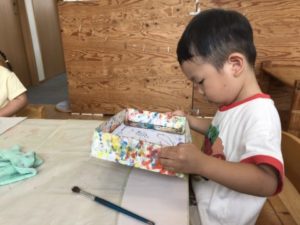 お絵描きができる場所ではビー玉を転がしてころころアートを楽しみました。箱からビー玉が落ちないよう慎重に傾けとても芸術的な模様ができました。自分で絵の具をだして「お水ちょうだーい!」「かきかきするやつちょうだーい!」など必要な物をリクエストしてダイナミックに絵や線をかいていましたよ。子どもたちのやりたーい!!という気持ちが楽しい遊びへと発展していきます。そんな子どもたちの姿を見逃さないよう見守っていきたいなぁと思う一日でした。