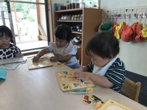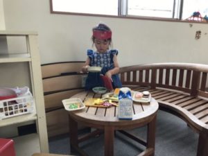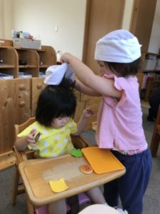 お部屋ではお絵描きができる場所や食べ物の玩具などで遊べる場所を準備してみました。食べ物の中からハンバーグを見つけてお皿に並べたり、お店屋さんの帽子を被っていた子を見て「かぶるー。」という声が聞かれたので和帽子をだすとそれを嬉しそうにかぶったり、お友だちにかぶせてあげたりしていましたよ。盛り上がっている途中でポテトをそっと置いて見ると「ポテトだー!」とすぐに気づき少し取り合いなどにもなっていましたが、うまく譲ったり渡したりすることができたのかあっというまにその取り合いの様子はなくなっていましたよ。自分の分を持ってそっと場所を変え1人の世界でポテトを袋にいれたりして遊ぶ子もいて、子どもたちなりにいろいろ考えて遊んでいるのだなぁと思う瞬間でした。