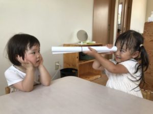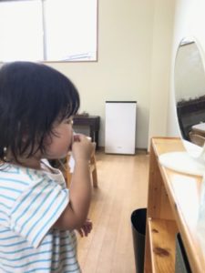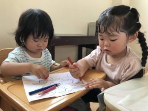 最近、子どもたちは色に興味を示し「あか!」「あお!」「ぴんくー!」っと自分の好きな色を友だちに伝えたり「〇〇ちゃんはどんないろがすき?」などと友だちの好きな色を尋ねたりと、言葉でやり取りをする姿が沢山見られる様になってきました。時には「どんないろ~がすき♪」と歌い出す子もいるのです。「どんないろ~がすき♪」と音楽が流れると子どもたちは大合唱。子どもたちの興味がどの様に広がっていくのかなぁ?っとこちらがワクワク。色に関するアイテムを用意してみることにしました。色のカードを出してみると1枚ずつペラペラとめくり「〇〇はぴんくがすきー!!」「これこれ!!このいろ!!」と。大きなカレンダーを広げると、カレンダーに書かれている数字の色に気が付いたようです。「くろ!」「あかとぴんくもあるよ」子どもたちから沢山の色の名前が聞こえてきます。クレパスや色鉛筆、絵の具を並べるとそれぞれに好きなアイテムを選び遊びを展開させています。絵の具を選んだ子は「みじゅ(みず)いれてー!」っとリクエスト。水を入れてみると次は「ぬりぬりするやつちょうだい!」と次々と出て来るリクエスト。リクエストにあった物を用意すると「そうそう、これこれ!!」子どもたちはダイナミックに色を使って楽しんでいました。そこへちょっと仕掛け。ペットボトルに水を入れ子どもたちが使っていた絵の具を水の中にポトリ・・・。目の前で水の色が変化していく様子に「うわあ~、すご~い!!」っと歓声が上がりました。すると・・・次々に「これもいれて~」「きいろもいれた~い」などと子どもたち発信で、水の中に入れていきます。ペットボトルの中に出来た色水。それを手にシャカシャカとみんなで振っていました。1人の子がペットボトルに入った色水を園庭へと持って行き外で楽しんでいる様子を見て、周りの子どもたちも真似てみんな園庭へ。色水が入ったペットボトルをコロコロと転がしたり、大事そうに抱えたり・・・それぞれに楽しんでいました。園庭からお部屋に帰ってくると子どもたちは帽子や靴を自分で片付けています。1歳児の子は2歳児の子に手伝って貰っていたのが日常だったのですが・・・1歳児の子も2歳児の子の姿を見て自分で片付けようとしています。そんな姿がとても頼もしく見ていて「がんばれ!!」っという気持ちになります。ここで直ぐに大人が手を貸してしまっては子どもたちのこのような姿を見ることは出来ないでしょう。頑張る姿をじっくりと見守っていきたいと思います。