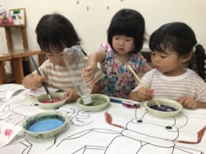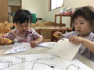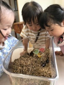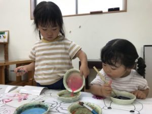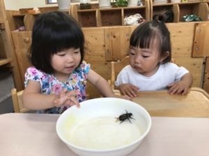 カブトムシが幼虫から成虫へと成長し、狭かったお部屋から大きなお部屋へと前日に引っ越しを終えたのです。引っ越しを終えたカブトムシはみんな飼育ケースの土の中へと潜っています。飼育ケースを覗き込む子どもたちから「いないね~」「ねんねしてるんじゃない?」などと会話が聞こえてきます。掲示してあったカブトムシの写真カードを飼育ケースの横に並べ「これといっしょなんだよ、カブトムシ」などと教えてくれる2歳児の姿もありました。子どもたちのこのような姿からカブトムシをトレーの中へ出してみることに。トレーの中にカブトムシを出してみると・・・あちらこちらとトレーの中を歩き回るカブトムシに興味津々。そこへカブトムシの写真カードを手にやって来た2歳児の子が「ジェリー(ゼリー)いるよ、あかいやつね」と。よーく見ると2歳児の子が手にしていたカブトムシの写真カードは赤いゼリーを食べているカブトムシの写真カードだったのです!!それを見て「なるほど~」っと関心してしまいました。カブトムシをトレーの中から机の上に出してみると・・・机の上を歩き回るカブトムシ。自分の方向へ向かってカブトムシが歩いてくると「きた!きた!きゃーーー!!!」っと大騒ぎ。そーっと後ずさりするものの、それでもカブトムシをみたい!と言う想いは増すばかり。再びカブトムシの傍へと戻ってきて見入っていました。子どもたちがカブトムシを見入っている間に別の場所でこっそり・・・カブトムシのイラストを描き始めてみました。すると・・・子どもたちのアンテナが素早く反応し「おえかきする~」「はしゃみ(ハサミ)かして~」子どもたちからリクエストが聞こえてきます。リクエストのあった物を用意。そこから子どもたちは次々と遊びを展開させていきます。「ぴんくのかきかきほしいの・・・」この声に色のアイテムも用意すると「どんないろ~がすき♪」と歌い出した2歳児のお友だちがいました。みんなで歌いはじめたのです。「どんないろがすき♪」の音楽を流すと、自分の好きな色を口ずさんでいました。クレパスや絵の具、水性ペンなど好きな色のアイテムを選んで楽しんでいました。絵の具は色同士を混ぜ色が変わる様子に「うわあ~!!いろがかわった~!!と驚いた表情を見せ、色の変化を楽しんでいる姿を見つけ、真似をし遊びを展開させていました。