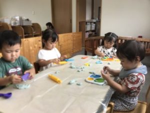 粘土を手で細かくちぎったり、へらやめんぼうを上手に使ってみたり、粘土の感触を楽しみながら遊んでいました。