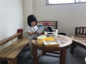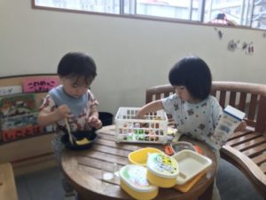 フライパンに食べ物のおもちゃをのせフライ返しを使ってクルクルまぜて、とても楽しそうにお料理をしたり、お皿に具材を並べて楽しむ姿が見られました。