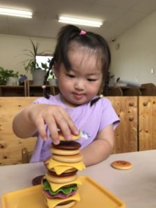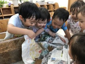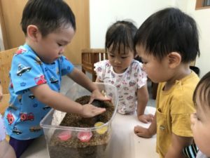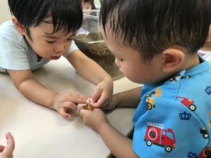 園庭からお部屋へと戻って来た子どもたち。それぞれが好きな玩具や絵本を手に楽しんでいます。積み木の入ったケースを選び、机の上に運んできた1歳児のお友だちがいました。その姿を見てみんな集まって来たのです。どうするのかなぁ?っと見ていると・・・2歳児の子が円柱の積み木をそーっと立て始めています。それを見ていた1歳児の子が積み木を立てようとしていますが・・・なかなかうまく立てることが出来ないようです。すると隣にいた2歳児の子が「はい、どうぞ!」っと積み木を立ててあげていたのです。大人が直ぐに手を差し伸べていたらきっとこのような姿を見ることは出来なかった事でしょう。そっと手伝ってあげている姿にとても優しさを感じ、こちらが温かい気持ちになりました。別の机ではカブトムシにもう夢中。カブトムシの魅力に引き込まれていきます。触ってみようとする子、ちょっと触るのは怖い・・・けど、見ていたい子など様々な姿がありました。すると・・・カブトムシの飼育ケースの中に入っていたカブトムシゼリーの色に気が付いた2歳児の姿がありました。「あかのゼリーがおいしいのかな?」「みどりもあるね」と。このような姿からカブトムシゼリーが入った袋を用意してみました。「カブトムシのゼリーだぁ~!」「あかと~みどりと~」と、袋の中からゼリーを出し机に並べています。カブトムシの飼育ケースの中のゼリーも少なくなってきていたので交換してあげる事にしました。「○○がゼリーあげる!」と、お世話が始まったのですが、ゼリーについているビニールの蓋を開けなくてはカブトムシはゼリーを食べる事が出来ないのです!ゼリーの蓋、子どもたちはどうするのでしょうか。子どもたちの様子を見ていると・・・自分がやりたい!「これ、どうやってあけるの?いっしょにあけようよ」お友だちがゼリーの蓋を開けるのを見ていたい子と、姿はいろいろ。ゼリーの蓋が硬くてなかなか開けられず友だちと協力し開けてくれた子もいました。新しい昆虫マット、カブトムシゼリー、とまり木を入れカブトムシのお家は完成。トレーの中に引っ越していたカブトムシを飼育ケースに戻してあげるとカブトムシたちが土の中へと潜っていきます。その様子を見て「みてみて~、もぐってる~!!」「あ~、みえなくなっちゃった・・・」カブトムシの姿が見えなくなりちょっと残念そうな子どもたちでしたが「あしたはみえるんじゃない?」と期待する声も聞えて来ました。絶賛、子どもたちのアイドル。カブトムシです!