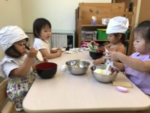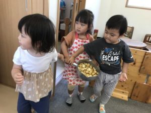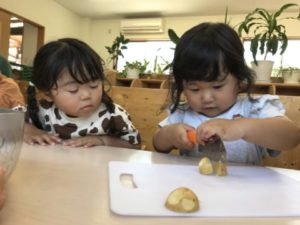 プランターのミニトマトやオクラが成長していく様子を登降園時に保護者の方と観察している姿があり、子どもたちは「トマト、あかくなってきた!」「オクラもあったよ!」と、友だちに伝える様子があり子どもたちの観察力には驚かされるばかりです。子どもたちから野菜の名前が幾つか聞こえてきたので野菜に関する写真カードを用意してみました。それを見て野菜の名前も聞こえて来るのですが、その他には野菜の色にも興味が広がってきたようです。色のカードも出してみると・・・「これはやさき(むらさき)!」「ピンクがすきなの」と、お友だちと色の話で大盛り上がり。楽しそうにやり取りを言葉でしています。子どもたちのそのような様子を見ながら数日前に綺麗に洗ったじゃがいもを用意してみました。その様子を何処からか見ていたい子がいたようです。「なに?なにするの?」と言いジーッと見ています。保育士がエプロンを身に着けていると・・・その姿だけで「やりたーい!!」と。更に手を洗いに行くと、子どもたちも手洗いをしています。数回、クッキングを実際に経験し手順を覚えているようです。園で収穫をしたじゃがいも。小さい物が多く、半分に切って給食の先生に調理して貰うことにしました。包丁をみると「あぶないよ」「いたいよ、おててあぶないから」と教えてくれました。包丁がとても危険な物だと理解しているようです。順番に切っていき「あとでかわってね」「あむないから(あぶないから)ね」などと包丁を使っている友だちに伝えていました。切ったじゃがいもを鍋にいれ「じゅうじゅうしないとたべれないよ」「やきやきしたらたべれるんだよ」と。「きゅうしょくせんせいにもっていく!」とみんなで鍋にいれたじゃがいもを運んでいました。「きゅうしょくせんせーい!できたよー」と言い、手渡していました。調理して頂いたじゃがいもは午後のおやつでみんなでおいしく食べました!!子どもたちからは「ん~おいしーーい!!」と大好評でした。クッキングもさまになってきた子どもたちです!