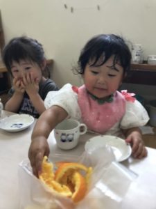 オレンジおいしかった~!袋の中にお片付けです。