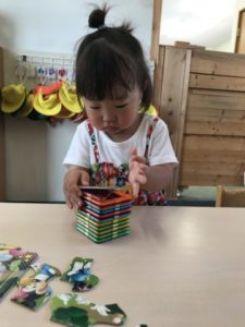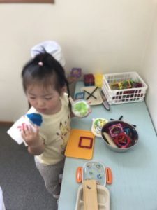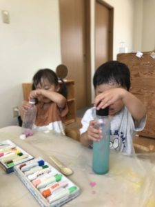 今日も元気に登園してきた子どもたち。かばんを片付ける前にカブトムシのお家を覗き込んで「ゼリーみんなたべちゃったよ!」と嬉しそうに報告してくれました。「ゼリーあげなくっちゃ!」とまたいつものように張り切った様子が見られましたよ。朝のおやつを食べた子から好きな物を見つけて遊びますが「ブロックであそぶー」と言ったり、何も言わずにお弁当箱やお皿などを見つけてごっこ遊びが始まったりしていました。しばらくそれぞれの好きな遊びが広がっていて、かき氷のメニュー表などを見ながら「どれにしますか~?」「ジュースで~す。」などとアイテムを並べてお店屋さんになりきっているようでした。別の場所ではペットボトルなどの容器と氷をいくつか用意してみると、容器の中に氷を入れてカラカラと鳴らして遊び始めましたよ。だんだん氷が溶けていく様子に気付き水になってくると、今度は「絵の具ちょうだーい。」と言って自分たちで入れ始めました。「もっと氷ちょうだーい。」という声から氷を渡すとそれが大きくて入らなくちょっと困った様子でしたが、しばらくして「はいったーー!」と歓声があがり嬉しそうでした。そのあとはジュース屋さんの開店で~す。ミックスジュースの音楽に合わせてシャカシャカ♪「こっちもいれていい?」と言いながらいろいろなミックスジュースができていました。