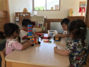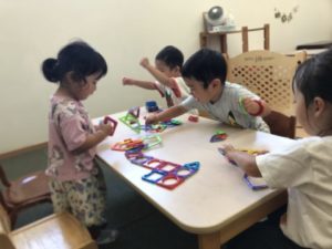 マグネット付きのおもちゃを思い思いにくっ付けて、おもしろい形がいくつもできていました。
