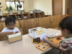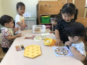 お部屋の棚の上から、おもちゃのトレーを手に持ったり、コップでコクコク飲み物を飲む真似をして楽しんでいるお友だちがいました。しばらくすると、ドーナツのおもちゃをトレーにのせて運び、椅子に座ってドーナツを食べる真似をしたり、トレーの上にドーナツを並べたり、下ろしたりし始めました。何がしたいのかなぁ・・・と様子をうかがっていると、「どれがいいですか?」「どうぞー!」と、お友達とやり取りが始まりドーナツ屋さんが始まりました。そんな子どもたちの様子を見て、壁に様々なドーナツの写真カードを掲示し、メニュー表をそっと置いてみました。早速メニュー表を指し、「これ。」と言って注文です。お店屋さんは、トレーにドーナツをのせて運んだり、棚をオーブンレンジに見立ててそこでドーナツを焼いている姿が見られました。また「はいおかねですー」という声も聞こえてきました。レジスターもそっと準備してみると、お会計が始まり、遊びがさらに展開されていました。別の所には、最近「やりたい。」と密かにブームになりそうな粘土を準備してみました。こちらでも「わぁ~ドーナツ!」と言って盛り上がっていました。他にも「パンだ!」「ウインナーみたい!」「クッキーできた」といろんな食べ物ができてお友だちと楽しそうに見せ合いっこ、とても楽しんでいました。