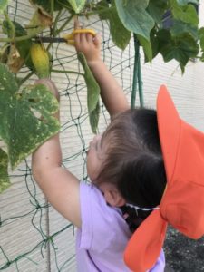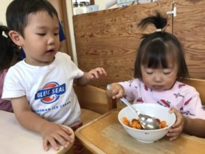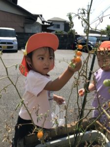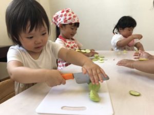 保護者の方と登園してきた2歳児のお友だちが「トマトがあかとオレンジになってるよーーー!!」っと教えてくれました。このような姿にトマトやきゅうり、オクラなど園で育てている野菜の写真カードを用意してみることにしました。写真カードを出していると・・・「なになに?」と子どもたちが集まって来ました。写真カードを机の上に広げ、手を包丁に見立て「トントン、チョキチョキ・・・」と、切る真似が始まりました。そこへ更なるアイテム玩具の包丁やまな板、和帽子等を出してみると・・・「まってました!」と言わんばかりに和帽子を被り、玩具の包丁を手に料理が始まりました。その手つきがまるで料理人。「は~い、できましたよ~!」っと友だちとやり取りをする様子も見られました。園で実ったミニトマトを収穫に出掛けると「あかとオレンジのトマトはたべれるんだよ」「みどりはまだたべれない」と友だちに教えてあげる2歳児もいました。収穫したトマトを使って今日はクッキング!トマトを半分に切り、今日の調味料は・・・・塩とごま油。子どもたちは調味料の名前も覚えていて「これはしおだね」と、教えてくれました。塩とごま油を入れまぜまぜ。「たべたーい!!!」子どもたちから聞こえ、みんなでおいしく頂きました。実はきゅうりも実ってはいたのですが・・・残念ながら食べられそうにありません。そのきゅうりを輪切りにすると子どもたちは腕の上に輪切りにしたきゅうりを並べ「つめたーーーい」「きもちいい」なんて声も聞えて来ました。「チョッキン!したい!」なんていう声もあり、きゅうりを切ってみることに。「チョッキン!あぶないよ~」「ちがでちゃうからね」と。何度も経験しているクッキング、包丁を持つ手もさまになってきました。とまり丘保育園の可愛い調理師さんたち、次のクッキングもきっと美味しい料理を作ってくれることでしょう。お楽しみに!
