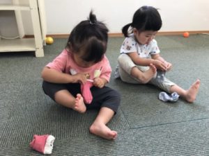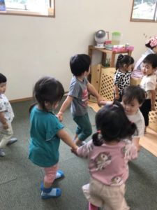 お部屋の中にあるお山の遊具で遊ぶ時は滑らないように靴下を脱ぐようにしています。今朝もさっそく靴下を脱ぎ、お山からじゃ~んぷ!「今度はピンクから登るよ!」と傾斜についている色を言いながら遊ぶ様子が見られました。同じタイミングでお友だちが違う面を登ろうとすると、自分と対角にいる事に気が付き「オレンジはあぶないよ~。」「ちょっとまてて」と声を掛けて順番やルールを決めて守ろうとする姿も見られましたよ。お山の遊具をお片付けすると今度は手を繋いでお散歩のように歩き始めました。始めは3人だったのが4人、5人と増えていき大きな輪になって楽しんでいましたよ。「いーれーて!」と言って自然に輪の中にはいっている姿が微笑ましかったです。