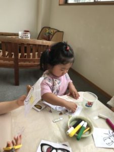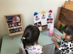 別の場所では昨日遊んだ色水が並べてあるのを発見!一緒に飾ってあったかき氷のメニュー表などもあり、それらを見て「どの色にしますかー?」「ピンク!」などという会話をしながら同じ色の色水をもってかき氷やさんになりきっていましたよ。色水を持っていた子がボトルを振ってみると泡ができてきました。「なんでだろう?」と不思議に思いながらも泡がでてきたのが楽しかったようで思いっきりシャカシャカ!そこから「茶色をいれたらどうかなぁ?」「虹色にしたいなぁ~」など様々な考えが浮かんできたようで会話も弾んでいましたよ。最後に園庭に持って行きバケツの中に入れたり、容器から容器に移したりして賑やかな雰囲気が広がっていました。