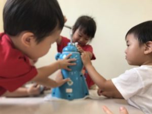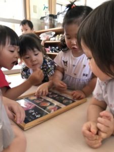 先日、実際に本物のかき氷機を使いかき氷を楽しんだ子どもたち。その事を思い出したようで「かきごおりたべたよね~」「あかいかきごおり、たべた!」「また、たべたい!」「あおいかきごおりがいいなぁ~」などと、友だち同士で会話が盛り上がっています。子どもたちのこのような姿から、かき氷のメニュー表を机の上に広げてみました。すると・・・1つのメニュー表を囲んで「これがいい!」「あかいのたべたい!」「みどりはメロンあじなんだよ」と味を想像する子やかき氷の色に興味を示す子など様々な姿みられます。数日前に体験したかき氷。子どもたちからどのような声が聞こえて来るのかなぁ~?っとこちらがワクワクしながらかき氷機や器、スプーン、シロップなどを用意していると・・・それを見つけ「かきごおりだぁ~!!」「たべたーい!」子どもたちは急いで手洗いを済ませていた。先ずは保育士が検食。すると・・・子どもたちの熱い視線を感じます。黙々と食べ進めていると・・・「みんなでたべればいいじゃん!!」こんな声にクスッと笑ってしまいました。先生だけずるい!なんて思ったのでしょうね。子どもらしくてとっても可愛らしい姿でした。1度経験しているからか、氷を削り出すとゴトゴトガタガタとかき氷機が動き出してしまいます。それを子どもたちは協力し、かき氷機を動かないように押えてくれる子、氷を削る子と別れてかき氷を楽しんでいました。みんな食べ始めると黙々と食べているので、かき氷機を押えてくれる子がいなくなってしまいます。すると「だれかおさえててよー」と、お願いしていました。好きな色のシロップを選び、氷にかけみんな美味しそうに頬張っていました。「あー、おいしかった」「また、たべようね」なんていう声も聞えて来ましたよ。何度も経験していると子どもたちが熟練の職人のように見えてきます。