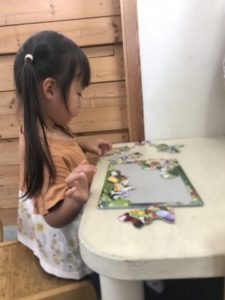 幾つかのパーツを組み合わせて様々な形を作り上げていく玩具を机の上に広げ、子どもたちが何かを作り始めました。2人で協力し何かを作っています。「ここにいれたらいいんじゃない?」「ここにつけてよ」「これもつけよ!」などと会話をしながら大作が出来上がっていきます。パーツを組み合わせ出来た穴から覗き込み「みえるよ!ほらみて!」と、まるで望遠鏡のようです。一緒に大作を作り上げた友だちと交代で穴から覗き、反対側にいた友だちと目が合いみんな笑顔でとっても楽しそうでした。1歳児のお友だちも2歳児のお兄さん、お姉さんが登園後、おたより帳にシールを貼っているのを興味深げに憧れの眼差しで見入っています。このような姿からシールを用意してみると・・・指先を器用に使って真剣にシール貼り。時には指先とは違う手の様々な場所や洋服に剥がしたシールがくっついてしまい悪戦苦闘。それでも根気よく剥がそうと真剣です。子どもたちのこのような一生懸命な姿に心を打たれます。子どもたちがやってみようとする真剣な姿や友だちとの関わり、一緒に楽しむ姿をそっと見守っていきたいと思います。