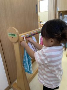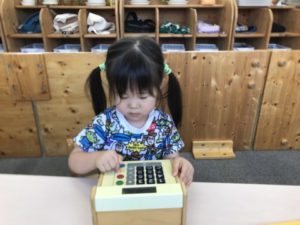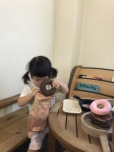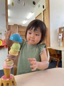 昨日、ドーナツの玩具を使っての遊びが盛り上がっていたので、続きができればいいなと思いと準備してみしました。今日はどんな子どもたちの様子が見られるか少しワクワクした気持ちでいました。早速、和帽子を見つけたお友だちは、自分で帽子を被ったり、「ドーナツいりませんかー?」と呼び込みをしてみたり、いろいろな姿が見られあっという間にドーナツ屋さんが開店しました。ドーナツをフライパンの上にいくつも上に重ね、タワーのようにしてそれをお友だちのところに配達。届けられたお友だちは「もっといける!!」とさらに積み重ね高ーいドーナツタワーの完成。中には「食べたら、歯磨きしないと歯が痛くなるんだよ」なんて言う声も聞こえてきました。お家の方に教えてもらって覚えているんだなぁと子どもたちの素直な一面に出会いました。別の場所ではアイスクリーム屋さんが盛り上がっていました。「いらっしゃいませ~何にしますか?」と注文を聞かれると、元気きよく「はい!」と返事をすると共になぜか敬礼ポーズ。あまりの張り切り方にクスっと笑ってしまいました。その後アイスを届けてもらいとても嬉しそうでした。こちらでもアイスのタワーに遊ぶ様子が見られました。アイスを何個も何個も重ねて落ちないように真剣な表情が見られ、集中していることが伺えます。楽しい遊びを通して、子どもたちのいろいろな呟きが聞こえ、子どもたちの成長を感じる事ができた一日でした。