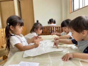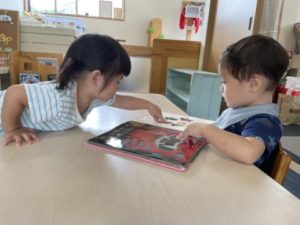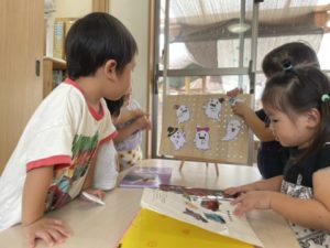 最近園庭で遊んでいる際に、2歳のお友だちが両手を前にだしながら「おばけだぞ~~」と言って楽しそうにおばけになって遊ぶ姿が見られます。それを見た他の子も一緒におばけに変身!「おばけだぞ~~」の声が響き渡っていました。お部屋の中ではおばけのてんぷらや、おまつりおばけなどの絵本も興味を持って見ていますよ。そんな様子からおばけのラミネートしたカード置いてみると、「これおんなじだよ!」と言っておまつりおばけにでてくるおばけの上に置いて形を合わせて遊ぶ様子が見られました。楽しい会話もたくさん聞かれ「おばけ怖いねぇ~」「おばけ退治する!お家のおもちゃでやっつける!」とお友だちと盛り上がっている中、今度はおばけたちをボードに飾っておいてみました。すると飾ってあったおばけたちを「ここにしようかな?」「こっちがいいよ!」と話し合いながら動かしてみたり、カードのおばけを持って動かしペープサートのような遊びに発展していました。すると「ハッピバースデートゥーユー♪」と歌が!!おばけたちの誕生日会が始まったようです。いろいろな会話が聞かれ聞いている方も楽しくなりました。