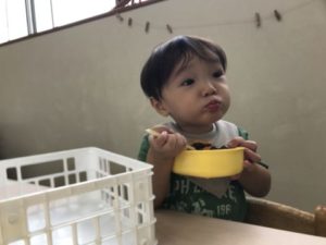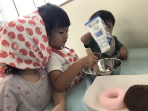 和帽子やトングを置いておくと、すぐに気づいて被り始め、「いらっしゃいませ~!」と今度はドーナツ屋さんが開店です!本物と同じ小麦粉のパッケージや、バターに見立てた箱などを見つけると、「あれ、ぎゅうにゅうないね・・・」と材料がひとつ足りないことに気づいた声が!そこで、きれいにした牛乳パックも準備すると、「ぎゅうにゅうあった!」と嬉しそう。ボールにドーナツ、バター、牛乳などを入れて「まぜまぜ~」と、おいしそうなドーナツができあがりました!