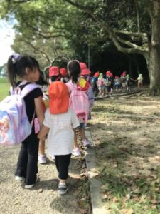 園庭で遊んでいるとなんだか楽しそうな声が近づいてきました。声の方を見てみると、河原田保育園のお兄さんお姉さんたちが遠足の為、歩いてきていました。そこでとまり丘保育園のお友だちも、お兄さんお姉さんに手を繋いでもらい、南部丘陵公園までお散歩へ!「○○ちゃん、かわいいね~」など声をかけられながら、一歩ずつしっかりとした足取りで歩いていると、「あ、どんぐり!」「ひがんばなある!」というお兄さんお姉さんの声に、不思議そうな顔で指さす方を見たり、「どんぐりあげる!」と分けてもらい嬉しそうな表情を見せる子どもたちでした。