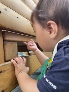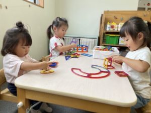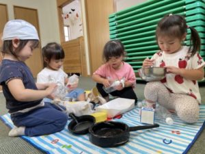 ドーナツの玩具をトレーに並べ「いらっしゃいませ~」「どれにしますか~?」っと、まるでドーナツ屋さん。フェルトで出来たドーナツや和帽子、トングなど更なるアイテムを用意してみると・・・そこから遊びが展開していきます。ドーナツを和帽子の中に入れ「いってきま~す!」「おかいものいってきますね」と。ドーナツが入った和帽子を脇に抱え、まるでセカンドバック。「いま、いそがしいの~」「おかいものいこうか?」と、友だちとの楽しいやり取りが聞こえてきます。「おかいものいこうか?」と、お友だちを誘う姿もありました。「おかいものいこうか?」と、友だちを誘ったのですが・・・「さっきいったばっかりでしょ!」「そんなになんかいもいかないの」「もうかわないよ」こんなクスッと笑える可愛いやり取りが見られました。和帽子だけでは物足りなくなったようで「かばん、ほしいの」と、2歳児の子が伝えにやってきました。鞄を渡すと和帽子からドーナツをすべて出し、鞄に入れ替えています。からっぽになった和帽子を頭にすると、次は「パーティーしようよ」とパーティーが始まりました。「おべんとうもっていこうよ!」「ここでたべる?」と言う声に新たなアイテム、レジャーシートを用意してみました。みんなシートの上に座って「いただきま~す」と。見ていて何だかとても楽しそうで見ているこちらがワクワク。お友だちと顔を見合わせて「たのしいね」と言葉でやり取りをし「そうだよね~」っと共感している姿にとても成長を感じます。子どもたちのこんなにステキな姿を大切に見守っていきたいと思います。