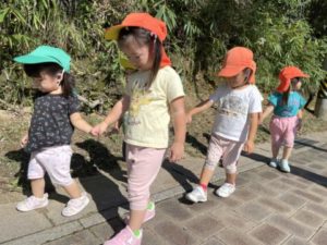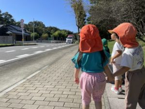 救急車のサイレンが聞こえてくると「きた、きたーー!!きゅうきゅうしゃー!!」っと大盛り上がり。園舎横の道路が見える場所にみんなで移動し、並んで救急車が通り過ぎるのをワクワクしながら待っています。子どもたちの後ろ姿からワクワク感がとても伝わって来ます。子どもたちのこのような姿から救急車や消防車のミニカーを用意してみると「ピーポー、ピーポー」と言いながら机の上を走らせていました。今日のキーワードは「きゅうきゅうしゃ」の様です。救急車や消防車などの写真カードやイラストを机の上に並べるとそれらを手にまたまた机の上を走らせ、机の上ではたらくくるまが大渋滞。子どもたちのこのような姿から本物の消防車や救急車を見に消防署へ出掛けてみる事にしました。お散歩へ出発!歩いていると・・・遠くからサイレンが聞こえて来ます。子どもたちは立ち止まってサイレンが聞こえてくると方向をじーっと見ていました。救急車の姿が見えてくると「きたきたーーー!!」っと大喜び。救急車を見送り、さらに歩き進めていくと消防署が見えてきました。消防署は見えてきたのですが・・・「あれ?いない・・・きゅうきゅうしゃ」と、少し残念そう。見たかった救急車が消防署に停まっていないのです。2歳児の子は「おでかけにいったんじゃない?」と。すると・・・救急車が消防署へ帰ってきたのです!!「かえってきた!きゅうきゅうしゃ」「どこにいってたんだろうね~?」なんて疑問の声。救急車から降りてきた消防隊員の方が手を振ってくれると、子どもたちも嬉しそうに手を振り返していました。何台もの救急車を見ることができ、子どもたちは大満足だったようで「きゅうきゅうしゃ、いっぱいみたねー」なんて言う声も聞こえ、今日は救急車一色の1日でした。