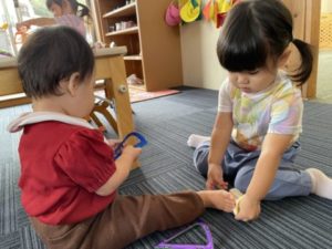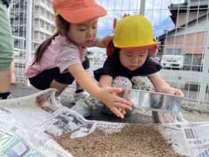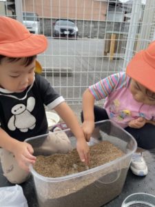 10月より新しいお友だちが入園し、周りの子どもたちは新入園児のお友だちの事がとても気になる様子。新入園児の傍へ行き、顔をのぞき込んだり、玩具を渡してあげたりと、みんな優しいお兄さん、お姉さん。ハイハイしていると「どこいくのー?」っと追いかけ、顔を見合わせニッコリ。何とも微笑ましい姿でした。棚の上に置いてある飼育ケース。飼育ケースの横から土の中にいるカブトムシの幼虫がチラッと見えています。それを見つけた2歳児の子は「ようちゅうさん、うごいてる~」と、大興奮。「ちょっとおっきくなったんじゃない?」このような声も聞こえ、今日はカブトムシの幼虫が入っている飼育ケースを覗いてみる事にしました。飼育ケースの蓋を外すと・・・「うんち、いっぱいしてるじゃん!」と、虫が大好きな2歳児の子が教えてくれました。うんちがいっぱい!それは大変!!ふるいや新聞紙を用意すると子どもたちは「やりたい!」と。新聞紙を敷き、ふるいを子どもたちに渡してみると・・・なんと上手に使いこなしているではありませんか!以前にもふるいを使ってカブトムシの幼虫のお世話をした事があり、それを思い出したようです。「ようちゅうさん、うんちいっぱいでたんだね」などと言いながら、飼育ケース内を綺麗にしてくれていました。飼育ケースの中の昆虫マットを全て出してみると、大きく育った幼虫が見えてきました。幼虫の姿が見えると「うわぁ~!!!おっき~い」「うごいてる~」「ちょっときもちわるいね」などと、子どもたちの反応は様々。飼育ケースに新しい昆虫マットを足し、綺麗になったお家が完成。幼虫たちをお家に戻してあげなくては!虫が大好きなお友だちがトレーの中にいた幼虫を飼育ケースの中にそーっと戻してくれました。お家に戻してもらった幼虫たちは急いで昆虫マットの中へと潜って行く様子を子どもたちはじーっと観察。「はいっていっちゃったね~」「もうねむいんじゃないの?」「そうだね、もうねんねだね」などと友だちと会話をし、楽しんでいました。