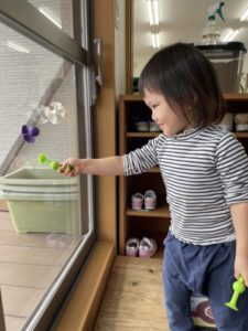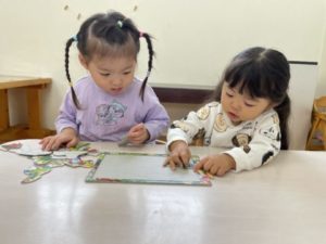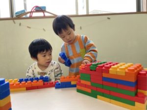 棚に置いてある玩具を自分たちで机の上に運んできて遊び込んでいます。運んできた玩具は積み木。1人の2歳児の子が積み木を縦にいくつか並べ「ドミノ!」と。幾つか並べた積み木をそーっと・・・人差し指で押すと「カタン、カタン」と音を立てて倒れていくのが面白かった様で、周りにいたお友だちも一緒に倒れた積み木を立て直し、繰り返し楽しんでいました。周りにいた子どもたちもその面白さに虜。倒れていく度に笑い声が起きていました。友だちが面白い遊びをしていると、それを自分も同じ様に真似、やってみようとする子、楽しんでいる友だちと協力しながらやってみる子と、姿は様々ですが想いはひとつ。「楽しそう!」という言葉に尽きます。「これやりたい」「これ、かしてほしい・・・」と、子どもたち自ら伝えにやってきます。子どもたちからリクエストのあった玩具を用意すると、そこから遊びが展開。離れた所から見ていると初めはブロックを高く積み上げています。高く積み上げたソフトブロックがまさかの倒壊。さて、どうするのでしょう。すると・・・次は繋げたソフトブロックを全て外し、カラフルで立体的な物が出来上がっていくではありませんか!「まだ、ここがあいてるからダメ」「このかたちがちょっとないの・・・」と困った様子。ここで大人が声をかけては子どもたちの世界が崩れてしまうのでグッと我慢。暫く見ていると「それ、ちょっとかしてほしいの、かしてー」っと伝えているではありませんか!「いいよ~、これ?はいどうぞ!」とやり取りしていました。今回は「いいよ~、どうぞ!」と、貸してもらうことができたのですが、毎回そうはいかないのです。ケンカになってしまうこともあります。自分たちの想いを伝え、相手の気持ちに少しずつ気づいていってくれることでしょう。そんな子どもたちを温かく見守っていきたいと思います。