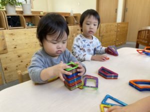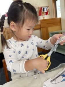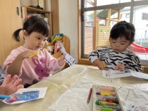 「くつした、ドクターイエローなんだよ。ほら、みて~!」っと、登園後友だちに見せている2歳児の子がいました。すると・・・その会話が聞こえていたようで別のお友だちが傍へとやってきました。傍へやって来た子も「○○はパトカーのくつしたはいてるよ」と、見せています。そこから「△△もおうちにパトカーのくつしたあるよ!」などと話が盛り上がっていました。ドクターイエローの靴下を履いていた2歳児の子が「ドクターイエローイエローはさぁ~、どうろははしらないの。せんろをガタンガタンってはしるんだよ」と、話しています。別の子からは「きゅうきゅうしゃは、どうろをはしるよね」「ミキサー車もどうろだよ」と、沢山のはたらくくるまの名前が聞こえて来ます。子どもたちから聞こえてきた乗り物のイラストや写真カードを用意してみると・・・。「やりたーい!」「あかいろがいい」「きゅうきゅうしゃはあかだから○○もあか、かして!」などと色に関する声も聞こえてきました。早速、色に関するアイテムを用意すると・・・好きな乗り物のイラストを選び、色ぬりが始まりました。「△△はにじいろのきゅうきゅうしゃにする!」「○○はあかにしたい」と、カラフルな乗り物が出来上がっていきます。塗り終えると「はさみ、ちょうだい!」遊びが展開していきます。はさみを使い遊びを展開させていく子の姿が沢山見られる様になって来ました。1人のお友だちがはさみを使いだすと「○○もはさみしたい!」と、伝えにやってくるのです。はさみを渡すと「はさみ、あぶないよ」「おててきれちゃうから、きをつけて」などと、教えてくれる子の姿もあり、はさみは危険な物だというのをよく知っているようです。初めはチョキンと、1回切りだった子もいつの間にかチョキチョキチョキと連続切りが出来る様になっているのです!大人が「あぶないよ!」「ここをもつんだよ」「こうやってきるんだよ」などと言わなくても子どもたちは友だちがしている様子をよく観察し、真似ていきます。遊びながら少しずつ色々なことを学んでいく子どもたちをそっと見守っていきたいと思います。