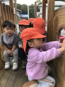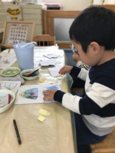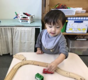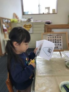 今日も、たくさんのおにぎりの写真が載っているボードをじーっと見ている子がいました。そんな姿お見ながら傍におにぎりの塗り絵と色鉛筆を置いてみました。その事に気が付くと早速、好きな色を選んで手に取りおにぎり作りが始まりました。そこへお友だちがやって来ました。最初にいたお友だちが「どれにしますかー?」と尋ねると、傍にやって来た子が「これが好きなの」と言葉での楽しいやり取りが見られました。上手に塗れると、おいしそうなおにぎりをお友だちと見せ合いっこ。おにぎりを塗り終えると「ハサミちょうだい」とリクエストがありました。ハサミを子どもたちに渡して見ると、紙の角度を少しずつ変えながら器用に切っていきます。中には、紙を半分に折り、折り目が付いた所にハサミの刃をあて、半分に切るなど大人のようなハサミの使い方ができる事に驚かされてしまいました。気分ものってきたようで「おっにっぎりの~なっかっみは~」とおにぎりの歌が飛び出すほどご機嫌な様子でおにぎり作りが進んでいきます。作りながらまたまたボードを見て「なんのあじがすき?」と、お友だちに質問する姿が見られてので、トッピングが出来るよう、色付きの紙を切って置いてみました。それにすぐに気が付いた様子。貼るには・・・?と考えに考え「のりちょうだい!」と。糊をすぐに準備。おにぎり製作はまだまだ続きます。のりとハサミというアイテムを使いながら子どもたちはまたもや考えました。糊を使ったベタベタのて手ではハサミは使えない。なんと、おにぎりの形を切るお友だち、糊を使ってトッピングをのせていくお友だちと役割分担をしている事にビックリ!大人の世界と同じような事がたった2歳児の子たちが自分たちで考えて出来てしまう事に驚いてしまいました。遊んでいる中でも子どもたちはいろいろな事を考えながら活動しているということに改めて気づかされ、こちらが勉強させていただく1日となりました。