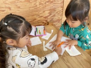 お友達の手の周りををなぞっています!うまくかけるかなぁ~