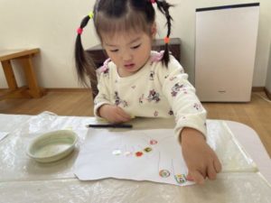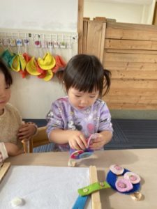 最近指先がとても器用になってきた子どもたち。保育士のエプロンのボタンをはめたりはずしたり、リュックのバックルをはめたり、かばんのチャックを開けたりしめたり・・・いろいろな事に興味をもって指先を使う場面が多く見られます。そんな姿から昨日も用意したフエルトのボタンの玩具を置いてみましたよ。いちごの形をしたボタンの付け外しは、ボタンに少し厚みがあり、穴をひっぱらないと難しく出来るかなぁ・・・と見守っていましたがそんな心配はいらなかったようです。集中して何個もボタンをはめたり外したりを繰り返していました。真剣な表情で一生懸命取り組んでいたので、全部できた時には「出来た!」という達成感いっぱいの嬉しそうな笑顔がとても印象的でしたよ。別の場所では動物のイラストにお絵描きです。「これペンギンだよ!」「レスカーパンダ(レッサーパンダ)だよ!」などとお話しながら楽しむ様子があったので、傍らに動物カードなども置いてみるとそれを見ながら会話が弾んでいました。ペンギンのイラストに色を塗る時は、ペンギンのカードを見ながら描く姿もありました。いろいろなカードの中に動物の実物大の手のカードも一緒に置いておいたところ、「ゴリラの手だよ!」「これはライオン!」と言い、自分の手の平も合わせて「おっきいねー!」と感動しながら比べていました。そこから、自分の手を紙の上に置き色鉛筆で周りを型どり遊びが発展していく様子が見られました。