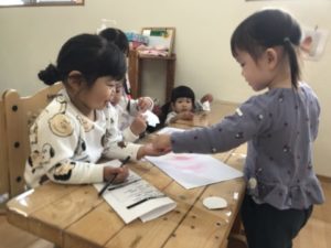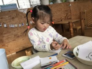 一方別の場所では「おえかきしたい!」という声があったので、クレヨンと一緒に動物や手の塗り絵を準備してみると、「ねこちゃんのぬりえしたい!」「○○は手のやつ!」と自分で好きなものを選び、塗り絵に挑戦。「みどりにする・・・」と呟きながら、爪を丁寧に丁寧に塗りつぶしていきます。全部の爪の色が塗り終わると「できた!」と達成感でいっぱいなようでした。