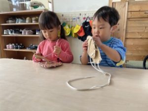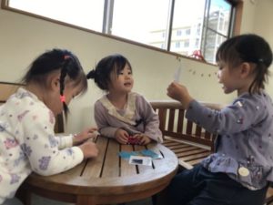 今日は動物の手の写真の中に大人の手と、お友だちの手の写真を1枚ずつ紛れ込ませてみました。「これ、ごりらのおててや」と、ひと際大きなゴリラの手を見て「おっきいね~!」と言いながら他の動物の手を並べて比べていると、近くにあった大人の手の写真に気が付きました。「これ、なんのて?」「○○のおててといっしょ!」と写真と手を合わせてみたり、他の動物のものと比べていると、今度はお友だちの手の写真を発見!「あかちゃんのて!」「○○ちゃんのおててや・・」とお友だちの手の写真を見つけ嬉しそうな様子。そこで、子どもたちの手の写真を撮り印刷してみると・・・「これ、○○の!」「こっちは、○○ちゃんのや」とすぐに気が付きました。自分の手と大人や赤ちゃん、更に動物の手といろんな手を並べて、見比べたり大きさ比べたりとさまざまな楽しみ方を見つけていました。また、動物のカードを置いておくと、「これ、なーんだ!」とクイズ大会が始まりました。「ねこちゃん?」「ぶっぶー」「こあら?」「せいかーい!」「じゃあつぎは、これ!」と子ども同士でクイズを出し合って盛り上がっていましたよ。