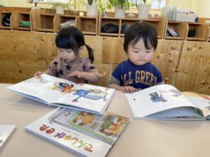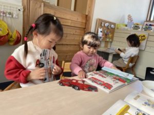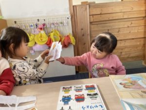 園庭で遊んでいると「ピーポー、ピーポー」と、遠くからサイレンが聞こえて来ます。子どもたちはこの音を直ぐに察知。「あ!きゅうきゅうしゃだ!」っと言い、みんな園庭のフェンス側へ集合し、ワクワクしながら救急車が通り過ぎるのを待っています。サイレンを鳴らしながら子どもたちの目の前を通過。救急車が見えるのは一瞬なのですが、子どもたちは救急車の姿が見えると嬉しさのあまりみんなでジャンプ。救急車の姿が見えなくなると「もういっちゃった・・・」っと何だかちょっぴり残念そうなのです。働く車の中でも救急車や消防車がダントツの人気。子どもたちに人気の救急車や消防車とその他の働く車の写真カードやイラストを用意してみる事にしました。もちろん、救急車や消防車の名前は1番に聞こえて来ます。その他の車も子どもたちは知っているようでロードローラーやミキサー車、新幹線はこまちやはやぶさなどの名前が。子どもたちは物知り名人です。そこから乗り物の色へも興味が広がってきたようです。イラストを用意すると・・・「あかのぬりぬりかして~」「あおがいい」「むらさきのでんしゃにする!」と意気込んでいました。色塗りが出来るアイテムを用意すると真剣ま表情で色塗り。すると・・・そこから「はさみちょうだい!」「ぺったん(のり)かして」「シールもほしいの」次々と遊びが展開していきます。色のアイテムの一つ、カラーセロハンを用意してみると透けて見えるのが楽しかった様で顔に当てて色の変化を楽しむ子の姿もありました。乗り物が載っているカードを何枚か並べるとカードを手に「これな~んだ?」「せいかーい!」「これは、むずかしい・・・」「ん~、そっか」と、2歳児の子どもたちはまるでクイズのように友だちに問題を出していました。数か月前にはまだ見られなかったこの様なやり取り。そんな姿にとても成長を感じ、嬉しい限りです。今日は乗り物一色の1日でした。さて、明日はどのような事に興味を示すのでしょうか?それは明日のお楽しみです。
