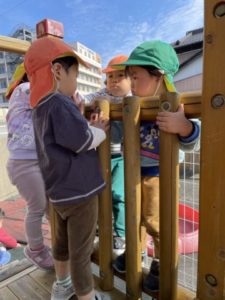朝から寒さにも負けず元気いっぱい遊んでいる子どもたちです。大型遊具の下に集まって遊ぶ様子があるのですが、よーく会話を聞いていると「みんなのパーティーはじめまーす。」や「もうパーティーはじまってるよー。」などという声が。どうやらパーティーをしていたようです!傍らにいたお友達は「行ってみよー。」「ひとがいっぱいであいてないよ。」など楽しそうな雰囲気でごっこ遊びをしている姿が見られました。子どもたちの頭の中にはきっとおいしそうな食べ物やみんなでお話している様子などいろいろ思いを浮かべながら遊んでいるんだなぁと感じる毎日で、想像力豊かな発想に驚かされています。