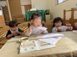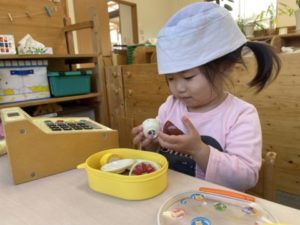 お部屋ではお絵描きや食べ物の玩具などいろいろな遊びを準備していると、園庭から戻ってきた子供たちは遊びたい物を選んで椅子に座り遊びこんでいました。お弁当箱の中に入っていたおにぎりを食べる真似をしてみたり、レジスターのボタンを打ってお店の人になりきったりしていたのですが、途中で帽子を被っていないことに気づいたのか棚においてあった和帽子をとりにいき被ってまた遊ぶというかわいらしい姿もありました。帽子わすれてた!!なんて思ったのかもしれませんね。お絵描きでは大きな紙を用意すると、「かきかきしたーい。」と言いながらクレヨンやクーピーでかいていましたよ。茶色っぽい紙だったので白や肌色なども使っていました。いつもはあまり使わない色なので「しろかけたね。」などという声もきかれましたよ。しかし、しばらくすると「紙ちょうだーい。しろいの!」とリクエストが!やはりお絵描きの紙は白がいいようです。その後はイラストの紙を形に切って「どれがいいですかー?」「少々お待ちください。」などまた違った遊びに発展していきました。