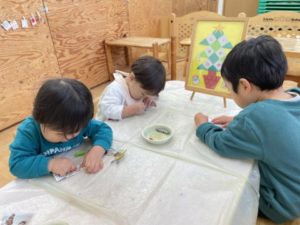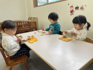 別の場所でもクリスマスのお絵描きで集中している姿が見られました。こちらはクレヨンでもくもくと色を塗ったり、カードを見ながら真似して描こうとしたり・・・真剣な雰囲気が流れていましたよ。