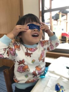 先週からお部屋に少しづつクリスマスの飾りつけをし、サンタクロースやトナカイなどを見て「サンタさんはプレゼント持って来てくれるんだよ。」「トナカイはお空からくるんだよ。」などと知っていることをお話してくれます。今日もクリスマスの写真カードを見ながら「きらきらしてるね。」「サンタさんはトラックに乗っているんだよ。」「ちがうよー!トラックじゃないよ。そりだよ!!」という会話も。色紙で作ったツリーを見て「シール貼ってあるね。」「おえかきしたーい。」などと遊びが始まってきました。クリスマスのイラストを用意すると、色をぬったりハサミで切ったり・・・「きらきらはりたーい。」というリクエストから、きらきらシールやテープ、セロハンなどをお置いてみると糊なども使って遊ぶ様子も見られました。「あわてんぼうのサンタクロース~♪」と歌いながらサンタさんの色をぬっている様子から子どもたちがとてもウキウキしていることが伝わってきました。カラーセロハンを使った際には目にあてて見える色も楽しんでいたようです。「虹色~」と最近のお気に入りのワードも出てきて次はどんな遊びに発展していくのかなぁと見ているこちらも楽しくなってきました。