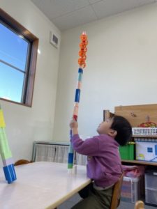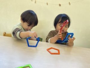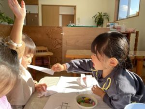 井型ブロックを幾つかつなぎ合わせ、それが注射器や聴診器に早変わり。「どこがいたいですか?」「ちゅうしゃしたらなおりますよ」「いたくないですよ!」などと言いながらお医者さんになりきっています。園庭でもお医者さんの続き。枯れ葉を拾い、葉の部分を取って筋だけになると・・・それが注射器に。園庭でも「ちゅうしゃしますね」などと言いお医者さんになりきっています。子どもたちのこの様な姿から注射器や絆創膏、お薬などのイラストをラミネートした物を用意してみる事にしました。すると2歳児の子が体温計のイラストをラミネートした物を手に「おねつ、はかりますね~」と。お熱を測って貰おうと手を挙げ脇に挟んでもらっていました。「わぁ~!!これはたいへん!37,8もあります。」「ちゅうしゃしないとなおりませんね」などと友だちとやり取りをしていました。見ていてまるで本当の病院の様です。「つぎのかんじゃさん、どうぞ~」と。何とも本格的なやり取り。自分が病院に行き、体験したことを遊びへと繋げているようです。絆創膏のイラストを腕に貼ろうとしている1歳児のお友だちがいました。それを見ていた2歳児の子が「シールでぺったんしたらいいんだよ」と伝え、2歳児の子が実際にシールを使って1歳児のお友だちの腕に貼ってあげていました。遊びながらも友だちが困っている様子を見ていたようで手伝ってあげている姿にとても成長を感じます。子どもたちはこうして遊びを通して様々な事を体験しているのです。今日はお医者さんと患者さんになりきって遊びを展開させていました。明日はどの様な事や物に興味を示すのか?とっても楽しみですね。