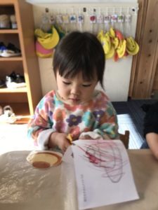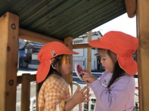 「ぬりぬりしたい。」という声が聞こえたので、今日はプリンの塗り絵やプリンの写真などを準備してみました。プリンのトッピングの果物から塗るお友だち、プリンの写真を見ながら写真と同じように塗るお友だちなど塗り方は様々。みんなそれぞれに工夫をして楽しんでいました。すると、そこへ小さなお友だちががやって来てお絵描きに参加です。みんなの遊ぶ様子をじぃーっと観察。みんな何やってるのかな?これは何かな?見たことないクーピーとお友だちの様子を見ていました。じっくり見て理解できたのでしょうか、クピーを手に握りしめ、手首を動かし描き始めました。筆圧はとっても薄く紙にも色が付いているかどうかという所なのですが、そのお友だちは自分も一緒にお絵描きを楽しんでいるといった様子で一生懸命描いていました。今度はこっちにしようかな?と色を選びながら遊ぶ姿に子どもたちのお友だちの姿を見ながら学んでいく力ってすごいなぁと感心させられるひと場面に遭遇することができました。遊びはまだまだ展開されていきます。プリンを美味しそうに塗った後は、「はさみちょうだい!」という声が聞こえてきました。いつも発信は2歳児のお友だちです。2歳のお友だちは日々使っているはさみを上手の意使いこなしていきます。そんな様子をまたまた近くで見ていた小さなお友だち。大きいお友だちに憧れを感じていたようで、ハサミをじーっと見つめていました。使いたいのかなと思いそっと渡してみると、やりたくて仕方がなかった様子。何とかはさみを持とうと持ち方、方向を変え試行錯誤し使い方の研究です。ハサミを開くことはとっても難しくなかなか上手にはいきません。それでも諦めず両手を使ってギュッと開き紙にハサミを当てていました。切る事は出来ませんでしたが、そのお友だちにとっては、ハサミが使えたことで大満足な表情でした。こういった小さな経験が子どもたちの自信へと繋がっていくんだなぁと、今日は子どもたちの成長していく過程を近くでたくさん見られた一日となりました。一人ひとりの成長をゆっくりと見守っていきたいと思います。最近、戸外で影を見つけて楽しむ姿が見られます。そこで、セロハンで作った色の眼鏡や影ができそうな物を準備してみました。早速、眼鏡をつけ園庭を探索してみたり、眼鏡をつけたお友だち同士で見つめ合ってニコー!っと笑い合っていたりとっても楽しそうでした。今日は色の眼鏡に興味を示し、陰への興味は残念ながら見られませんでした。今後どんな事に興味を持ってくれるのかとっても楽しみです。