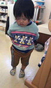 「できた!」お尻のところまでグッと上げて、自分でズボンを履こうと一生懸命です