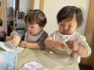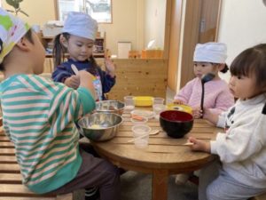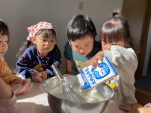 先週から盛り上がりを見せていたプリン。今日は子どもたちには内緒でこっそりとプリンの写真カードやイラストを掲示し、フェルトで出来たプリンやカップ、その他にボウルや泡立て器など玩具の調理器具を用意してみました。プリンのイラストをボウルに入れ、お玉を使ってグルグル混ぜながら「プリン、つくってるのでちょっとまっててくださいね~」「もうすぐできますよ~」などと言いながら調理中。「できました~」「どうぞたべてみてください!」子どもたち同士でこんな可愛いやり取りをしています。楽しそうに遊び込んでいる子どもたちを横目に本物のプリン作り体験すべく材料や調理器具、カップを用意していると・・・子どもたちのアンテナがビビビッ・・・!!「やりたーい」と、エプロンまで自分で身に付けて張り切っています。1人がやってくると・・・次々と子どもたちが集まってきました。ボウルや泡立て器を机の上に置くと「プリン、つくるの?」と、調理器具で気が付いたようです。手洗い、消毒を済ませ、ビニール手袋を装着。これがまた難しいのです。「どうやってやるの?」子どもたちは頭を悩ませていましたが・・・一人できると、そのお友だちが「こうやってするんだよ」と、教えてあげていました。プリンの素をボウルに入れると・・・甘くていい匂いがお部屋に立ち込めます。すると・・・パウダーが入っていた袋の開いた口を自分の鼻に近づけ「うわぁ~、いいにおいがする~」っと1人が言うと、これまたみんなもそそられ、匂いを嗅いでいます。あまりにもいい匂い。幸せな気持ちになりみんな笑顔です。ボウルの中にパウダー、牛乳などを入れ泡立て器で混ぜていきます。この工程をみんなにお手伝いしてもらいました。1人が混ぜていると、周りのお友だちがこぼれないようにボウルを抑えてくれていました。出来上がったプリンの素をカップに入れ、給食の先生に渡し出来上がるのをワクワクしながら待っていました。みんなで一緒に作ったプリン、午後のおやつで美味しくいただきました。