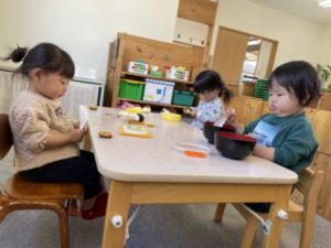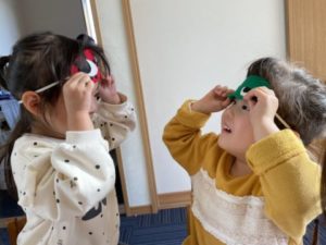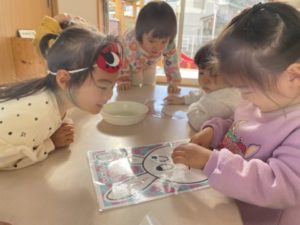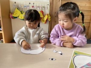 1人のお友だちが自分の両手を使い目尻や目の下を引っ張り「みてー!おもしろいおかお!」と、友だちに見せると周りにいた子も真似っこ。「こわいおかおだよ」「おもしろいおかおができた!」などと言いながら友だちと顔を見合わせ笑いが起こっていました。なんて微笑ましい光景なのでしょう。子どもたちのこの様な姿から福笑いを用意してみました。すると・・・福笑いの目隠しを付けて楽しむ子や顔の無いうさぎさんやぶたさんにおめめや鼻を置いて「おかお、できた!」と楽しむ子と、様々な姿がありました。そこへいつもと違う福笑いを用意してみる事にしました。子どもたちの前で紙に描いていくと「なに?なに?」「なんかおかおだね」「なにつくってるのかなぁ?」っと。目や鼻、眉毛、口と色々なイラストの物をトレーの中に入れ、その場を離れしばらく見ていると・・・「おかおがないじゃん!」「ここにおめめあるよ」「ここにおいたらいいんじゃない?」と、言いながら友だちと協力しお顔が完成していきます。このお顔は子ども1人1人みんな違うお顔が出来上がっていました。選ぶパーツによって違うお顔が出来上がり、なんとも面白い遊びになっていました。パーツ選びも「う~ん?どのおめめにする?」「キラキラおめめがいい」などと楽しそう。パーツを置き換え「こんなおかお」「おもしろいおかおになったね~」などと言いながらじっくりと遊び込んでいました。今日は福笑いが大盛り上がりの1日でした。明日はどの様な遊びが展開するのでしょう?とっても楽しみです。