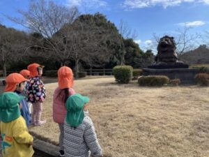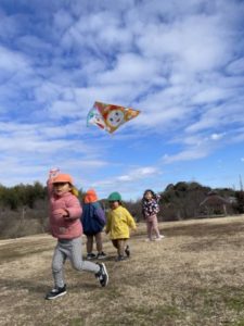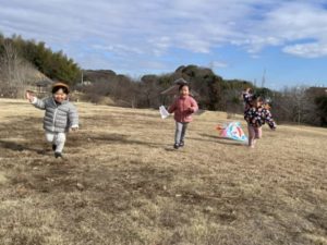 今日はみんなでたこあげに出掛けました。先日持って行った凧を少し改良して、今度はもっと高くあがるかなぁ?という期待と不安を感じながら前回と同じ芝生広場に出発です!風は前回よりも弱かったのですがそれがいい感じだったのか、大きなたこも、こどもたちが作った小さなたこもよーく飛びましたよ。「わぁ~!」という子どもたちの歓声が響き渡り、何度も何度も走って凧あげに挑戦する姿が見られました。大きな凧は「はい、どうぞー。」とお友だちと交換しながらみんなが凧あげ名人になっていましたよ。お友だちがあげている様子を笑顔で見たり、追いかけて走ったり・・・この時期ならではの遊びを思う存分体験できたようです。帰り道は楽しかった余韻にひたりながら歩いている中、公園にあったライオンの像を見つけ「ちょっとらいおんさん見ていこうよ!」という声から近くまで行ってみることに。顔を見て「こわそうだねえ~」「笑っているんじゃない?」など感想を言いながら見ている様子が印象的でした。そんなライオンさんにバイバイをして公園を後にし、次は消防署前へ。救急車がいないことに気づくと「病院に行ったのかなー?」「おばけにたべられちゃったんだよ!」と会話をしていると、ちょうどそこに救急車が帰ってきたのです!「ほらー!おばけにたべられてなかったじゃん!」と少し誇らしげな表情で話をしている一場面がありました。大人顔負けの会話も増えてきて、今度はどんな言葉が聞かれるのかなぁ?と楽しみな毎日です。とても寒い一日でしたが、たくさん体を動かしほっぺを赤くしながら一生懸命遊んでいる子どもたちはキラキラ輝いていました。