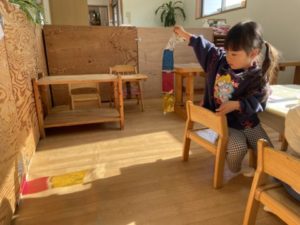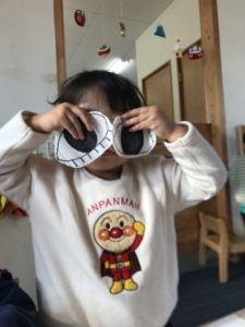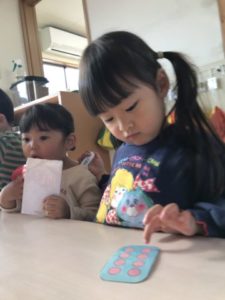 隣に座っている別のお医者さんは、錠剤の薬のイラストをスマホに見立てて「もしもし、はい」と深刻そうな表情で電話し始めます。「わかりました。」と電話を切ると、「おねつはかりますね」と右手に体温計、左手はスマホで、「35どです。」とスマホで入力。忙しそうに「まだはかってないのは・・・」と次のお友だちの熱を測りに行っていました。目薬や塗り薬のイラストも用意してみると「これ、おめめおくすり!(目薬)」とすぐに気づいたようです。「おめめおくすりしますよ~」とお友だちに目薬を差す真似をし、目薬をさされたお友だちも上を向いて目をぱちぱち。「ばんそうこうはりますね!」など大人が使う言葉が遊びの中でたくさん聞こえてきて、子どもたちの真似する力はすごいなぁと感心させられました。