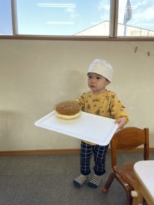 お盆にパンケーキを置き、そーっと運んでいます。