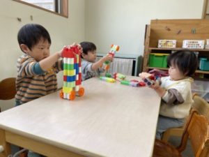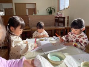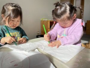 お部屋ではカードを使ったクイズをしてみました。乗り物のカードの中に動物のカードがあることを伝え一枚づつめくっていくと、真剣な眼差しでカードを見ていき「あっ!うさぎだ!」「これは消防車だよ!」などと答えてくれました。カードを見ながら知っている事をたくさん話をしてくれる中で「ぞうさん、おおきかったよー。」「うさぎさんはちいさいよー。」などという声があったので、今度は実物大の手のカードを出してみました。すると、自分の手の平をあわせて大きさの違いを感じたりしながら交代で手を合わせる姿がありました。その後のお絵描きでは自分の手を紙においてペンで型取りです。始めは保育士が描く様子を見ていましたが、次第に「○○もやるーー!」と言い書き始めました。「できたよー!」と嬉しそうに見せてくれた後は、その紙を折ってシールできれいに飾ってお手紙にしたり、はさみで切って形にしたりと様々な遊びに発展していきました。他のお友だちも加わり次は「おりがみちょーだい!」とリクエスト。「どうやっておるの?」と隣のお友だちに聞きながら折る微笑ましい姿もありました。今日も子どもたち同士の関わりがたくさん見られる和やかな一日となりました。