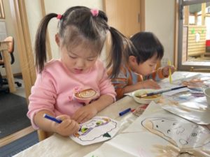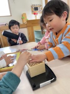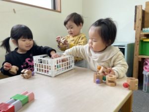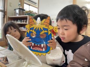 登園後、2歳児の子どもたちから「おにはそとー!」などと言う声が聞こえてきました。気が付けばもうすぐ2月。子どもたちから聞こえてきた「おに」と言うキーワードを元に今日は鬼に関するアイテムを用意してみる事にしました。節分に関する写真カードやイラストを準備していると・・・子どもたちは鬼のイラストを手に取り顔に当てています。この鬼のイラストは目の部分をくりぬいて覗き込めるようにしてあるのです。顔に当ててお友だちの顔を覗き込むと「キャー!!」っと大盛り上がり「かがみほしいの・・・」と言う声が聞こえ、鏡を用意してみると鬼のイラストを顔に当てて鏡をのぞき込んでいました。「わぁ~、おにになっちゃった!!」と。それを見ていた周りのお友だちも「かして~」っと伝えています。鬼のイラストでとても盛り上がり「おにさん、おえかきしたい!」このようなリクエストがありました。この声に早速、鬼のイラストを用意すると「ピンクのおににしようかなぁ~?」「みどりのおにがいい」と、色の名前があちらこちらから聞こえてきました。色に関するアイテムを準備してみたのですが・・・欲しい色が無いようなのです。さて、どうするのでしょう?友だちが使っていると「ちょっとかして!」と、友だちに伝えたり「ピンクがほしいの・・・」なんて自分の意志を言葉で伝えている姿にとても成長を感じます。子どもたち同士のこの様なやり取りの間に大人が介入するするのではなく、じっと我慢。すると・・・自分たちでどうしたらいいのか?こうやって見たらいいんじゃない?と、友だちと協力し解決していく姿へと繋がっていくのです。鬼で盛り上がった1日。節分豆も升に入れ、透明なケースで覆い掲示してみる事にしました。透明なケース越しに覗き込む子どもたち。充分、安全に気を付け透明なケースを外してみました。すると・・・そーっと触れたり、匂いを嗅いでみたり・・・。興味を持った様子。「これはたべたらだめなんだよ」「おにさんにおにわそとーってするやつ」などと節分豆の話もしていました。きっと「おにわそとーっ!」ってした経験があるのでしょうね。