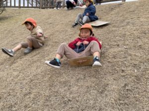 出発の用意ができ歩き始めると「しばすべりはあっちじゃないの?」と少し不安な様子。いつもの道と反対に曲がったのがわかったようです。違う道から行くことを伝えると安心したようです。子どもたちの地理間隔に驚き、成長した姿にも感動しました。芝生広場に到着すると、始めは板なしで自分のお尻で滑ります。二人で繋がって滑ったり、三人で滑ったり・・・お友だちがふえていく様子も楽しんでいたようです。何回か滑っていると寝そべって背中で滑ったほうがよく滑ることに気づいたようで「よくすべるよーー!」と笑顔いっぱいで楽しんでいました。おいてあった段ボールの板に気づくと「うーっま(くるま)!」と車の絵が貼ってある板を見て喜んでいる姿がみられました。大好きな車の板を持って一生懸命坂を上り「いっしょにすべる?」とお友だちに誘われ一緒に滑っていました。何度も挑戦し、最後にバランスをくずして倒れたり転んでしまうこともありましたが、それも楽しいようで笑顔が絶えなかったです。園に帰ってきても「シューー!した!」とお話してくれました。